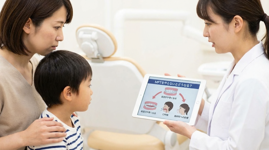 MFTを行わず舌癖や口呼吸を放置していると、歯並びや噛み合わせの悪化、矯正治療の効果低下と後戻り、発音の問題、顎関節や顔のバランスへの影響、睡眠の質低下といった様々な問題が生じる可能性があります。