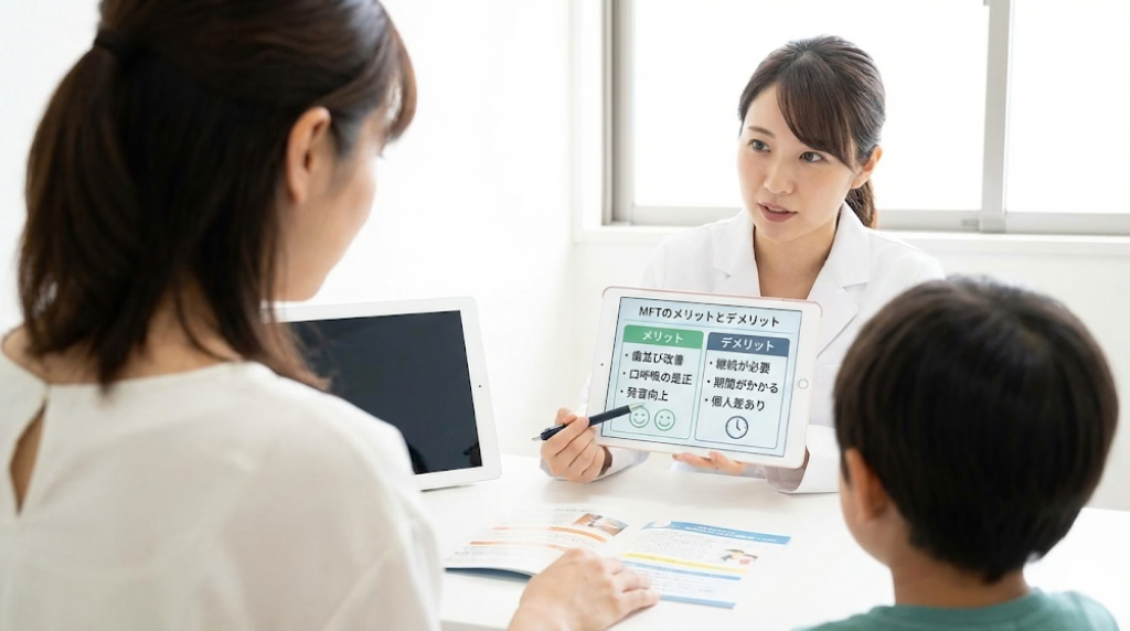 一方で、MFTには即効性がないというデメリットがあります。効果を実感するまでには数か月から1年以上かかることもあり、根気強く続ける必要があるでしょう。