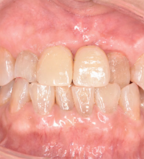 歯の色が気になる、歯茎との境目にブラックマージンが出てきている。歯間乳頭再建術(歯茎を伸ばす:歯周外科治療)を行ったうえで、補綴治療(オールセラミッククラウン)を行いました。