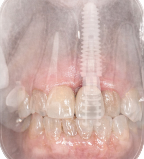 前歯部は見た目と機能の両立が重要な部位です。インプラント埋入時にGBR(骨造成)とCTG(結合組織移植)を併用し、審美性と安定性の両立を図りました。