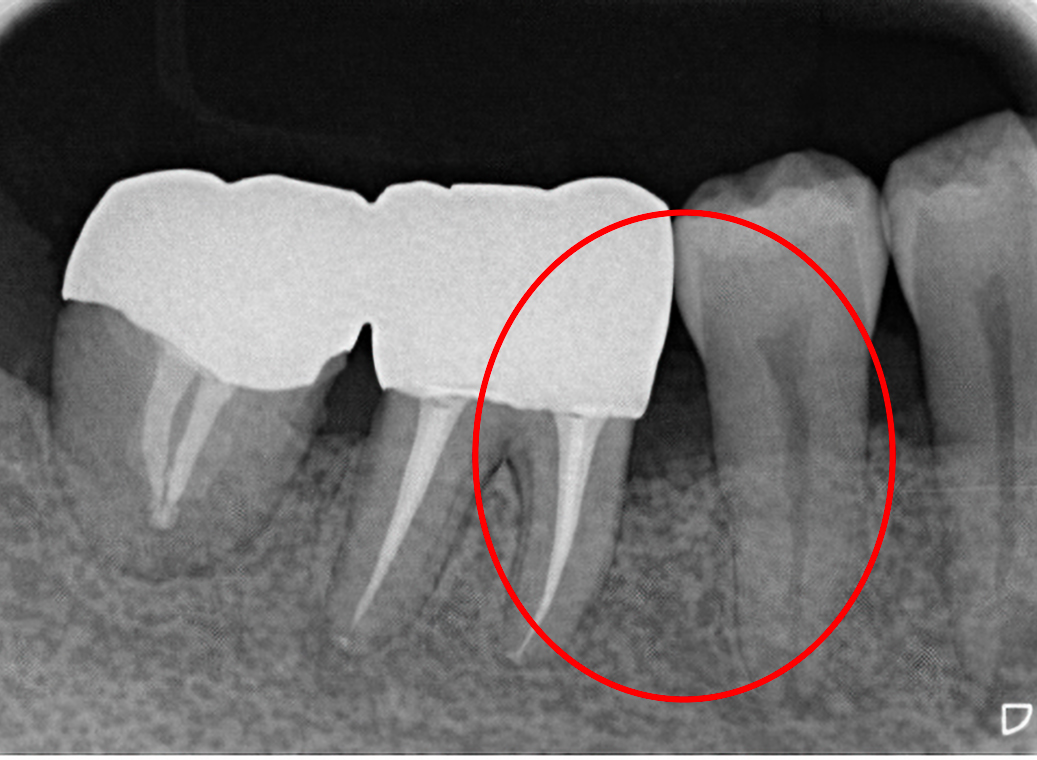 奥歯のグラグラ。通常は抜歯検討となる『根分岐部病変』(奥歯の歯根が分岐した部分:根分岐部に細菌感染が起こり、歯の周りの骨が吸収してなくなる病気)を骨再生療法により、保存しました。経年後も維持しています。